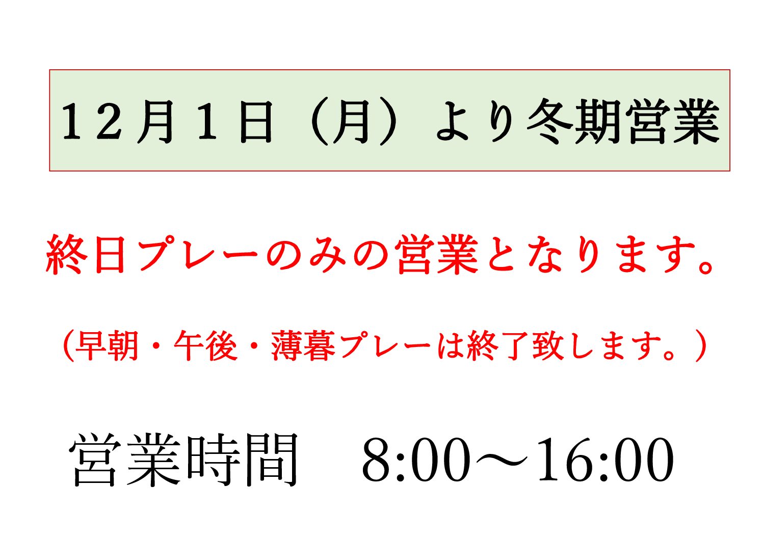 12月1日(月)よりクローズまでの期間は冬期料金になります。日没が早いため終日プレイのみの […]